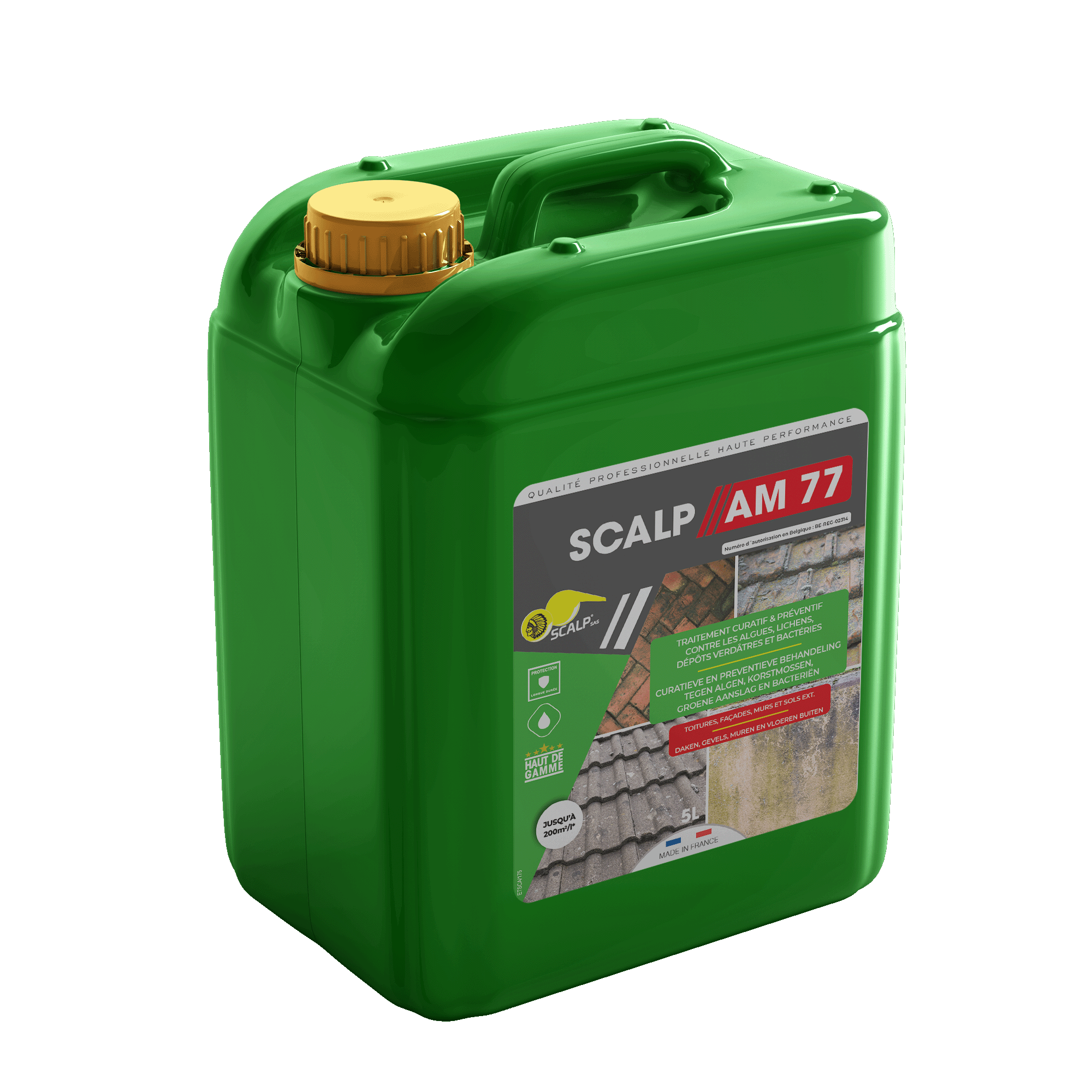SCALP AM 77 est un traitement anti-dépôts verts professionnel conçu pour protéger durablement des dépôts verts, algues, lichens et micro-organismes présents sur les surfaces extérieures du bâtiment. Formulé en phase aqueuse, ce produit désinfectant et algicide agit en profondeur tout en préservant les supports traités.